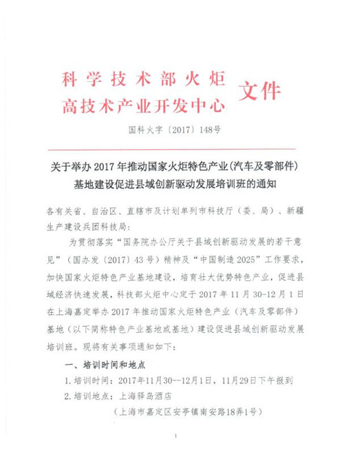 關(guān)于舉辦推動(dòng)國(guó)家火炬特色產(chǎn)業(yè)(汽車及零部件)基地建設(shè)促進(jìn)縣域創(chuàng)新驅(qū)動(dòng)發(fā)展培訓(xùn)班的通知