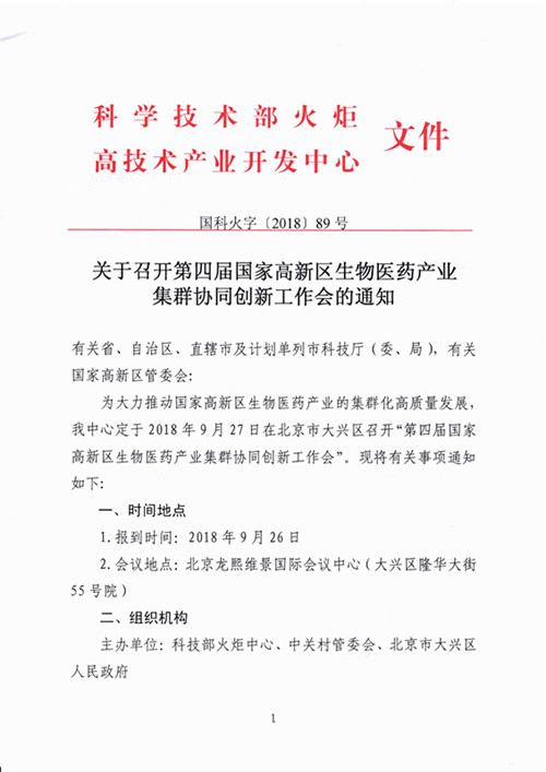 關于召開第四屆國家高新區生物醫藥產業集群協同創新工作會的通知