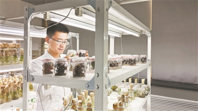 图④ 甘肃农业大学干旱生境作物学国家重点实验室基因挖掘实验室科研助理朱金勇在观察组培苗生长情况。本报记者 颉满斌摄