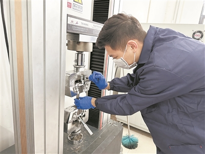 图⑨ 郑州大学化学学院科研助理李皓扬在使用拉力机测试结构胶剪切样件。本报记者 孙越摄