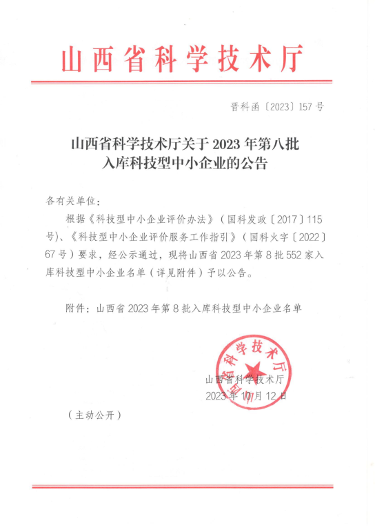 山西省2023年第8批入庫科技型中小企業名單公告正文.jpg PICTURE