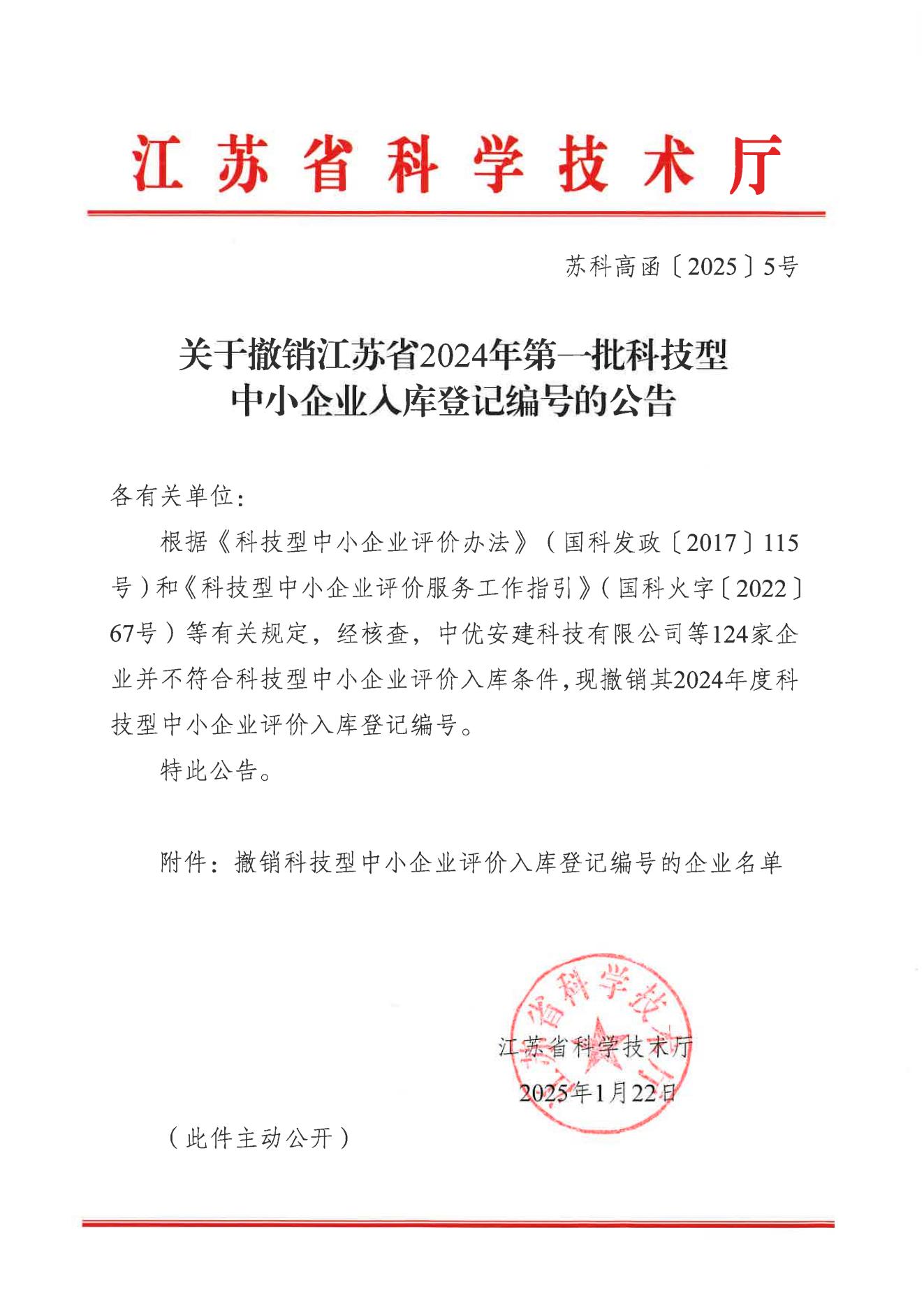 江蘇省2025年第1批撤銷編號科技型中小企業(yè)名單公告