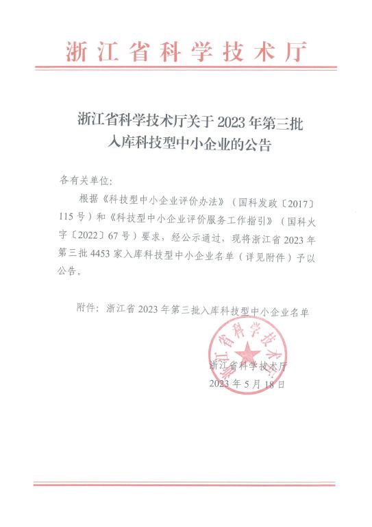 浙江省2023年第3批入庫科技型中小企業(yè)名單公告