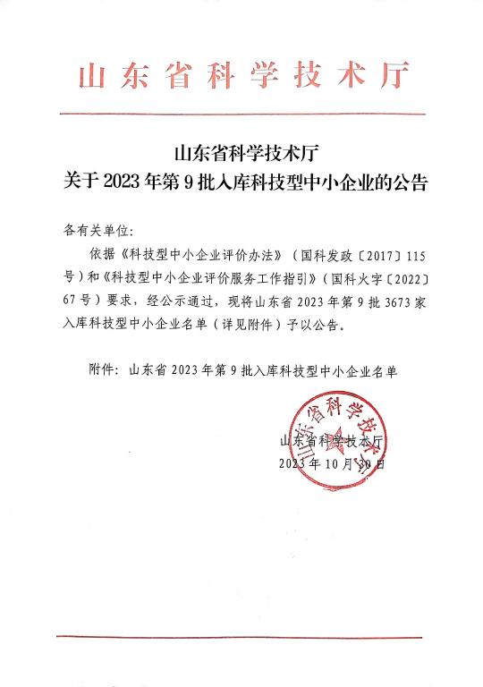 山東省2023年第9批入庫科技型中小企業名單公告正文.jpg PICTURE
