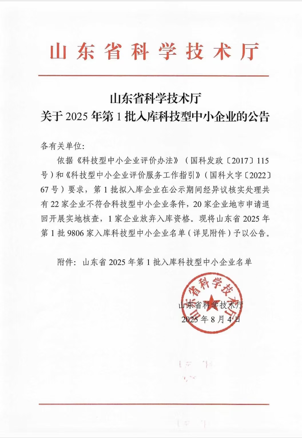 山東省2025年第1批入庫科技型中小企業名單公告正文.jpg PICTURE
