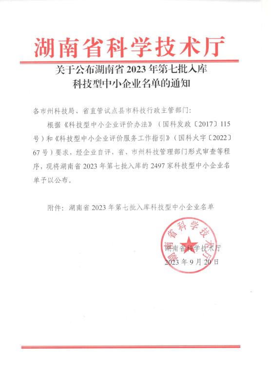 湖南省2023年第7批入庫科技型中小企業名單公告正文.jpg PICTURE