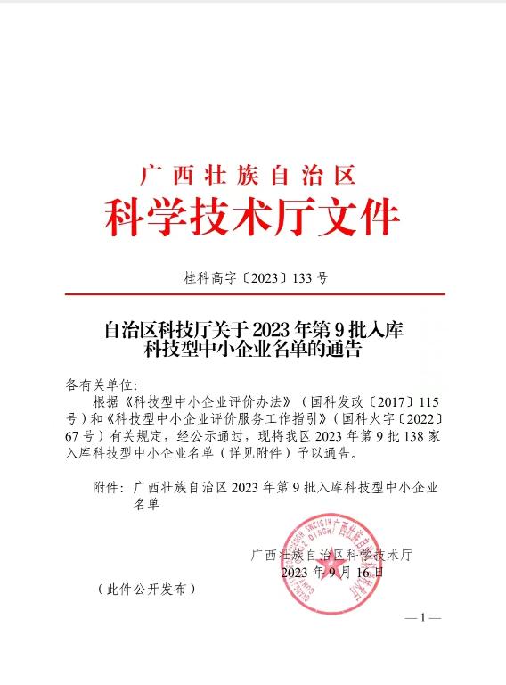 廣西壯族自治區2023年第9批入庫科技型中小企業名單公告正文.jpg PICTURE