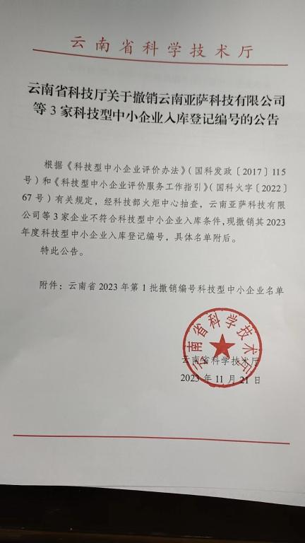 云南省2023年第1批撤銷(xiāo)編號(hào)科技型中小企業(yè)名單公告