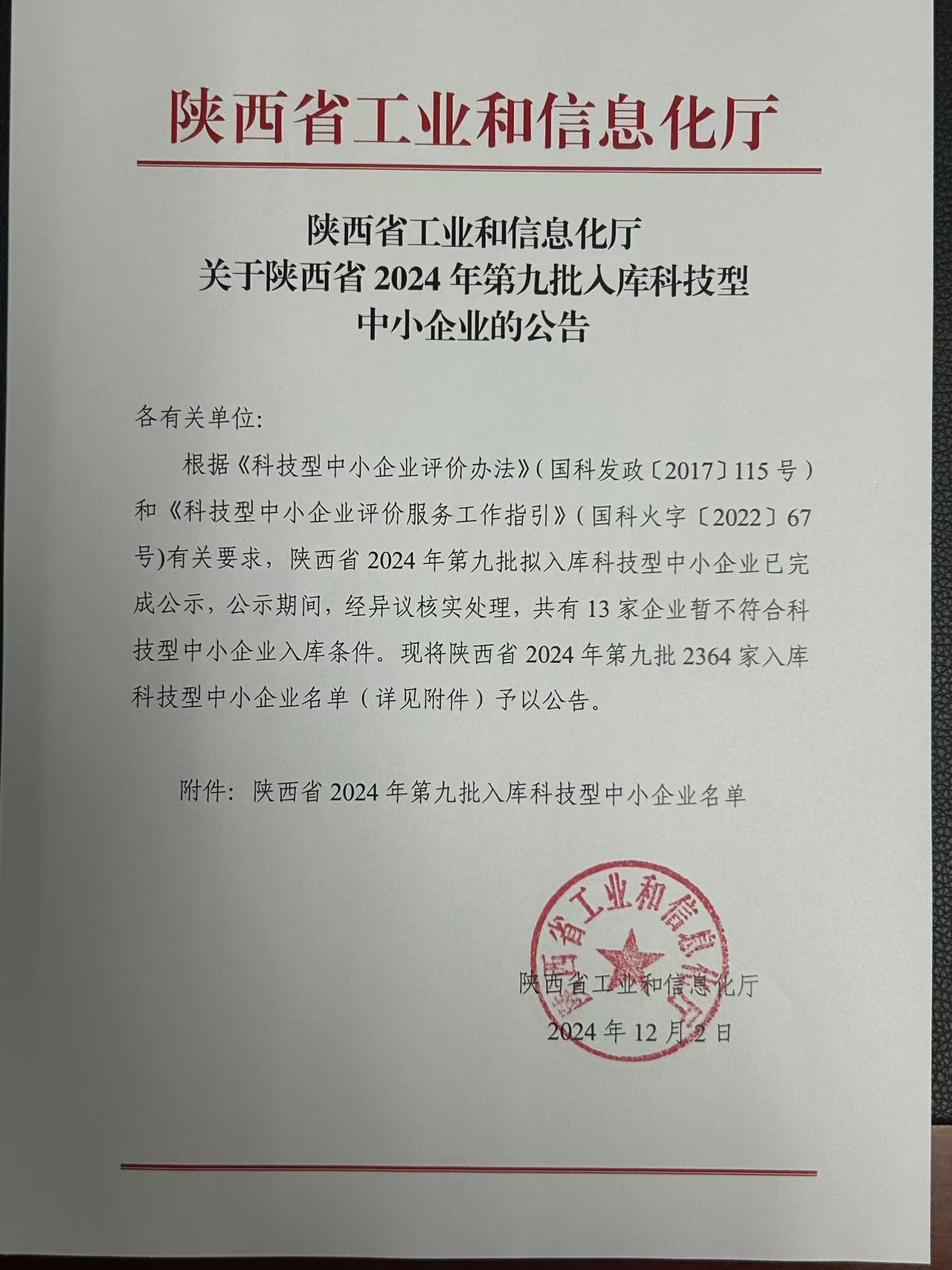 陜西省2024年第9批入庫科技型中小企業名單公告正文.jpg PICTURE