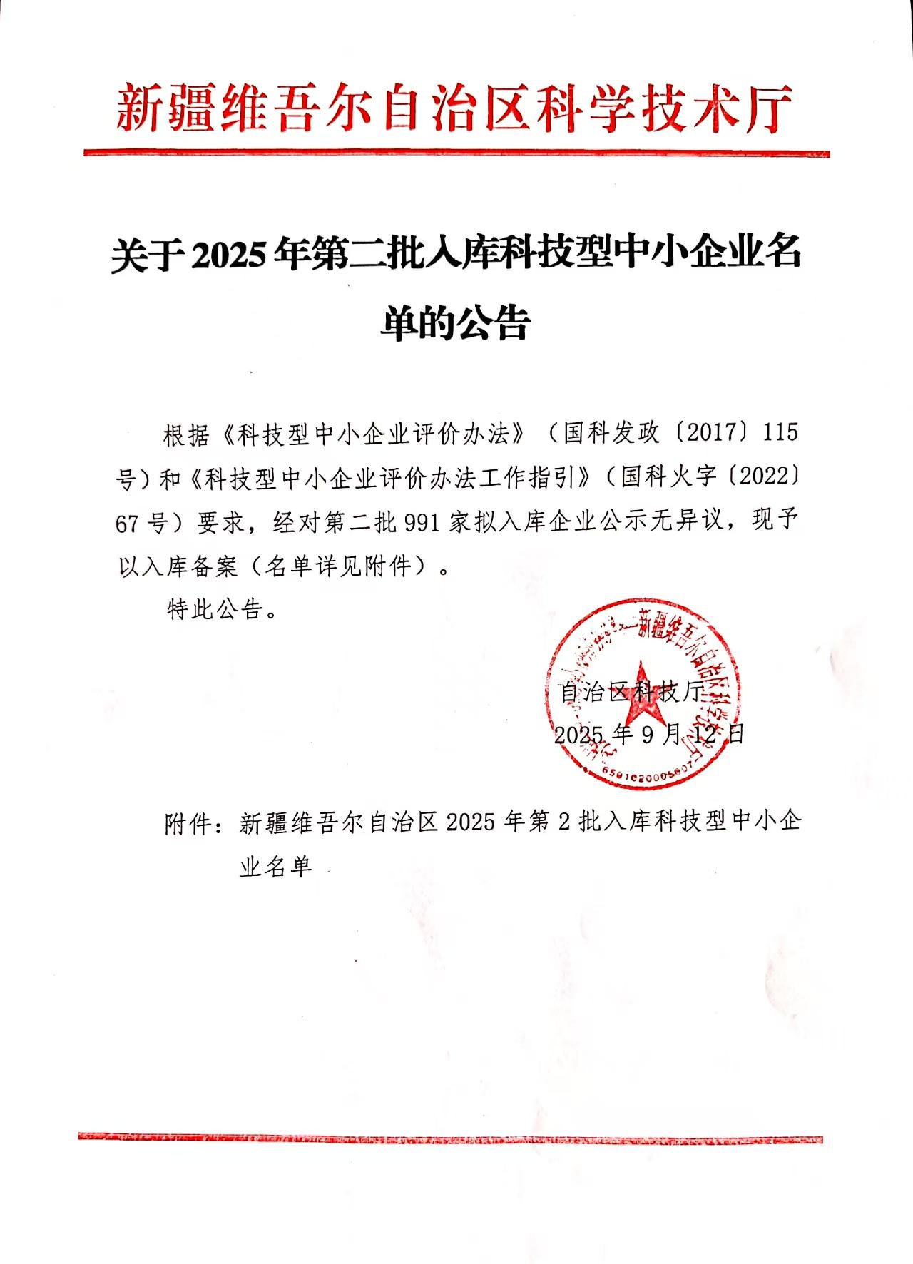 新疆維吾爾自治區2025年第2批入庫科技型中小企業名單公告正文.jpg PICTURE