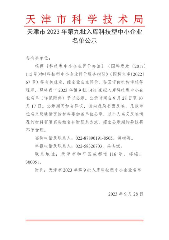 天津市2023年第9批擬入庫科技型中小企業名單公示正文.jpg PICTURE
