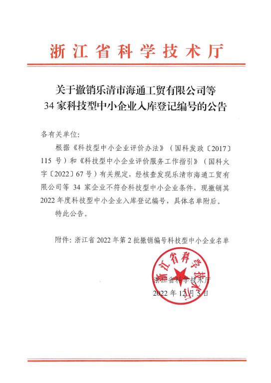 浙江省2022年第2批撤銷(xiāo)編號(hào)科技型中小企業(yè)名單公告正文.jpg PICTURE
