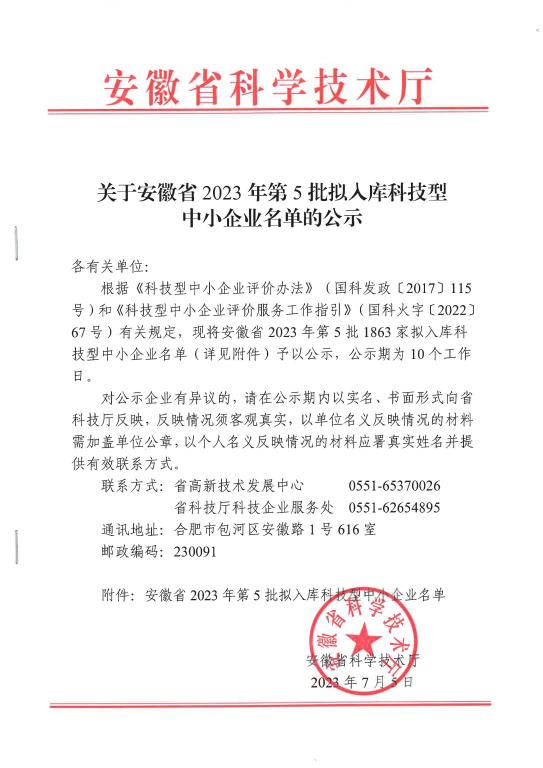 安徽省2023年第5批擬入庫科技型中小企業名單公示正文.jpg PICTURE