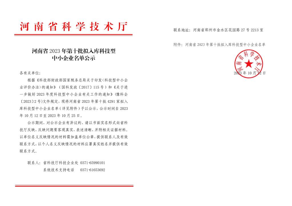 河南省2023年第10批擬入庫科技型中小企業(yè)名單公示
