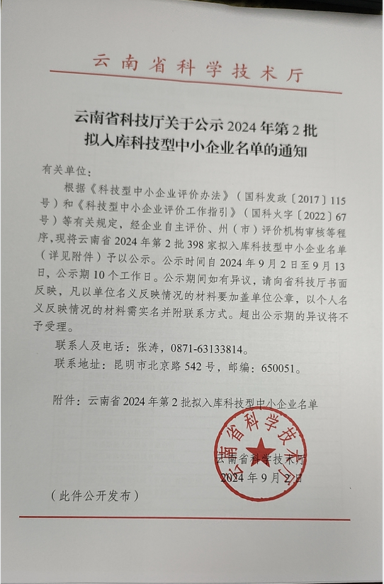 云南省2024年第2批擬入庫科技型中小企業名單公示正文.jpg PICTURE