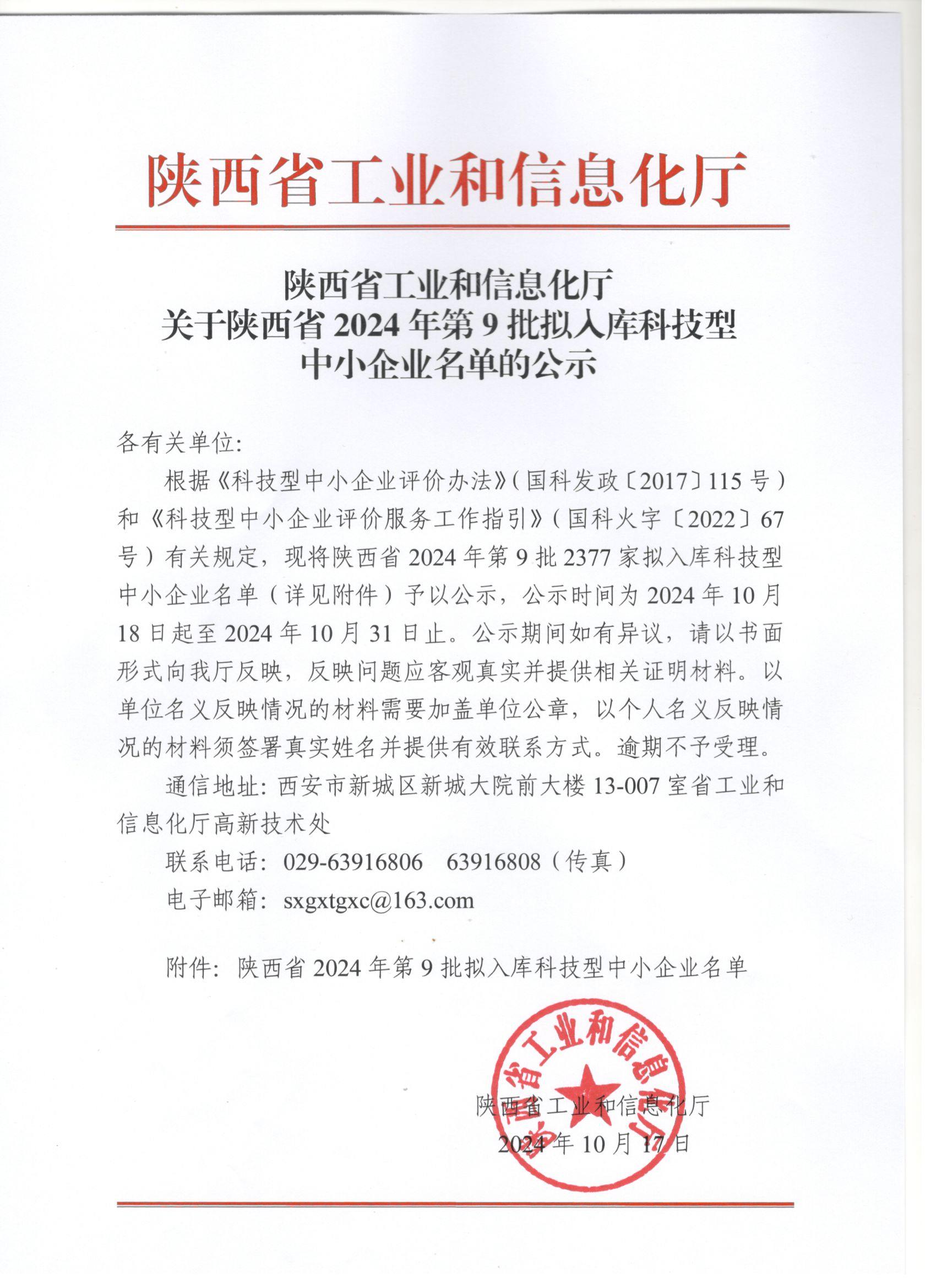 陜西省2024年第9批擬入庫科技型中小企業名單公示正文.jpg PICTURE