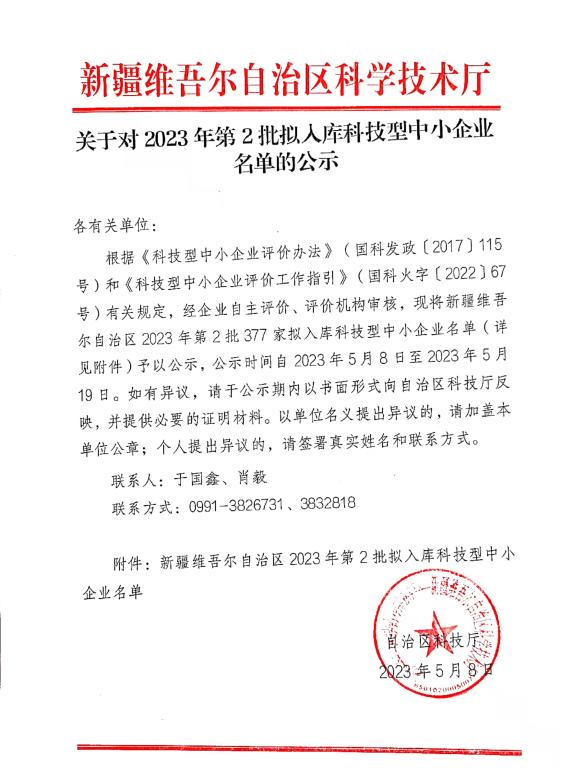 新疆維吾爾自治區2023年第2批擬入庫科技型中小企業名單公示正文.jpg PICTURE