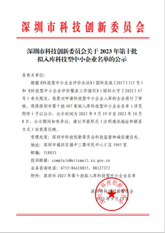 深圳市2023年第10批擬入庫科技型中小企業名單公示正文.jpg PICTURE