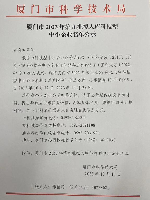 廈門市2023年第9批擬入庫科技型中小企業名單公示正文.jpg PICTURE